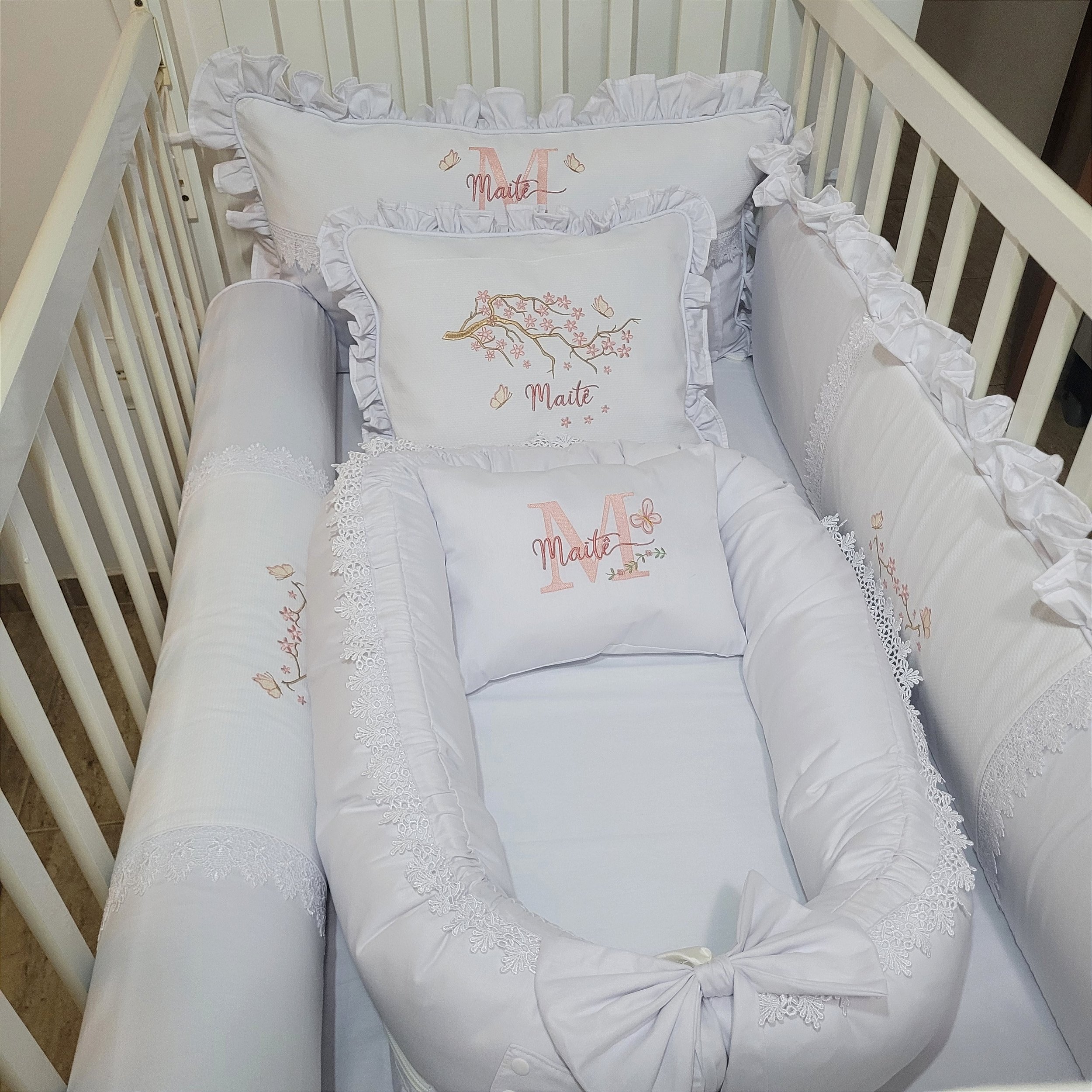 O quarto da bebê mais florido e colorido com lindos protetores de berço bordados em branco e rosê